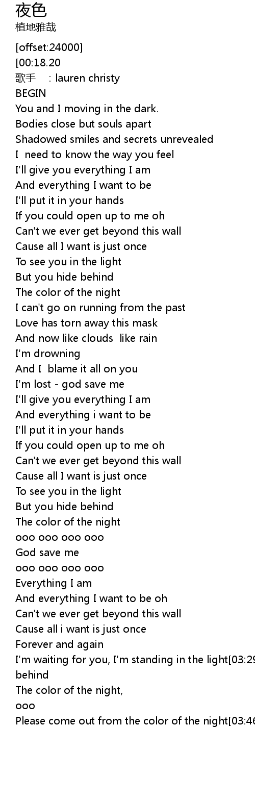 | [00:15.00][00:18.20] | The color of the night |