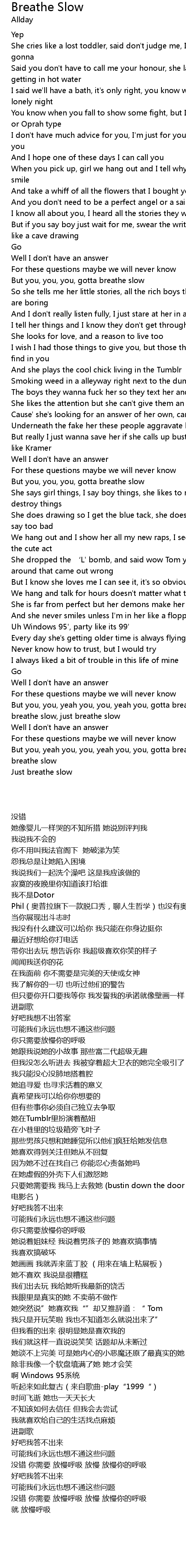 | [03:18.91] | But you, yeah you, you, yeah you, you, gotta breathe slow, just breathe slow |