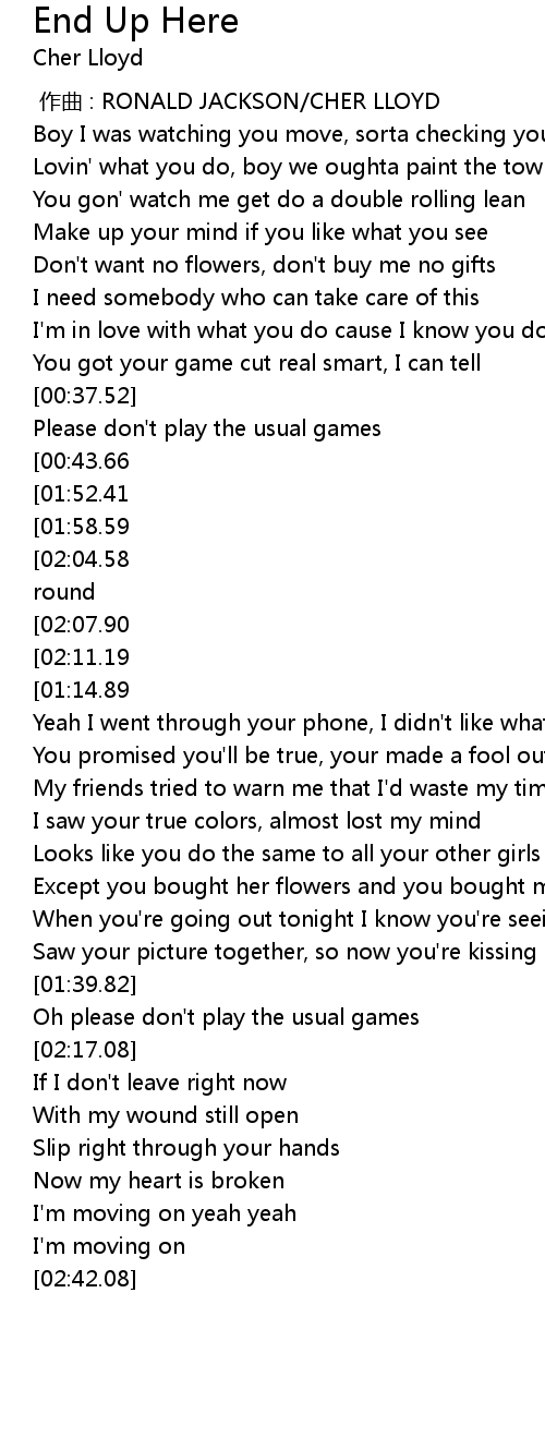 | [02:48.48][01:58.59][00:56.32] | And I I I, I didn' t wanna end up here |