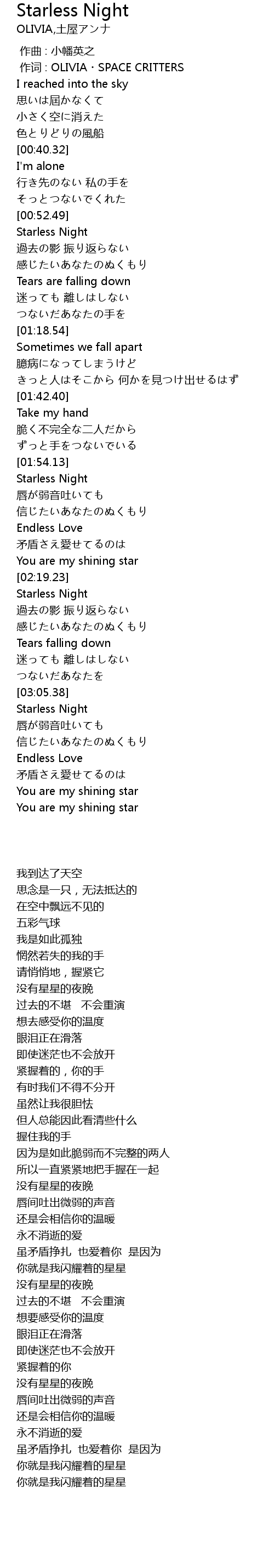 | [00:01.00] | 作词 : OLIVIA・SPACE CRITTERS |