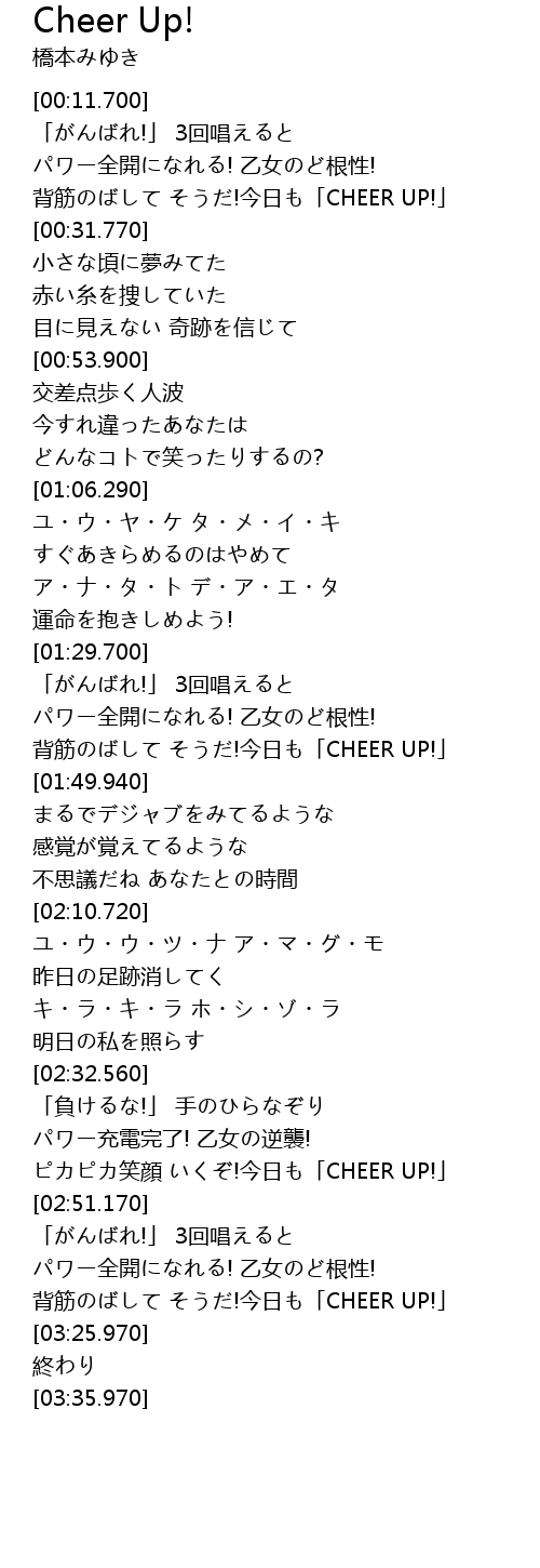 | [03:17.890] | 背筋のばして そうだ!今日も「CHEER UP!」 |