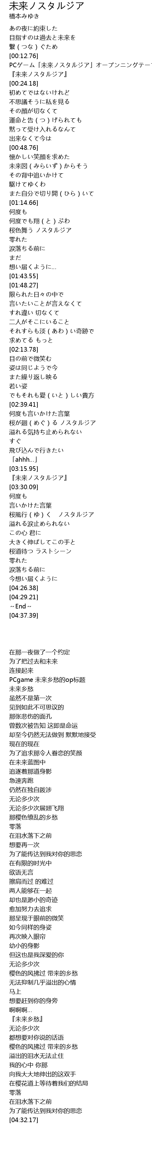 | [00:18.96] | PCゲーム「未来ノスタルジア」オープンニングテーマ |