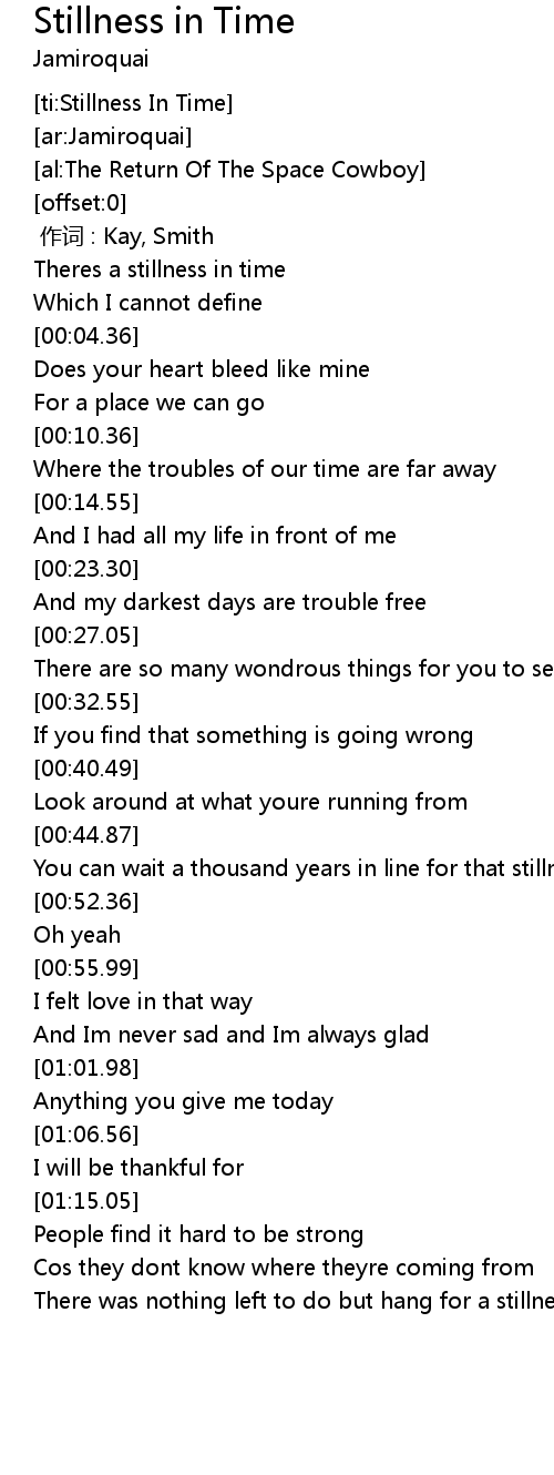 | [00:01.05] | Theres a stillness in time |