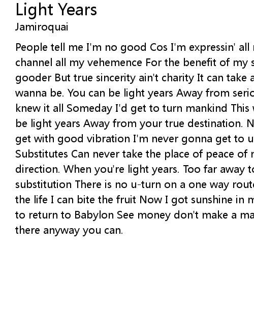 People tell me I'm no good Cos I'm expressin' all my sentiments Now I got to channel all my vehemence For the benefit of my self defence And you can be a do gooder But true sincerity ain't charity It can take a life time to be How you wanna be. You can be light years Away from serious intention And I thought I knew it all Someday I'd get to turn mankind This way If you don't know you can be light years Away from your true destination. No conscious escalation Until I get with good vibration I'm never gonna get to use that use that earthly power Substitutes Can never take the place of peace of mind Losing all sense of direction. When you're light years. Too far away to turn you back on substitution There is no u-turn on a one way route Goin' up when I learn to love the life I can bite the fruit Now I got sunshine in my life. Light years Never to return to Babylon See money don't make a man But if you really want you get there anyway you can. |
