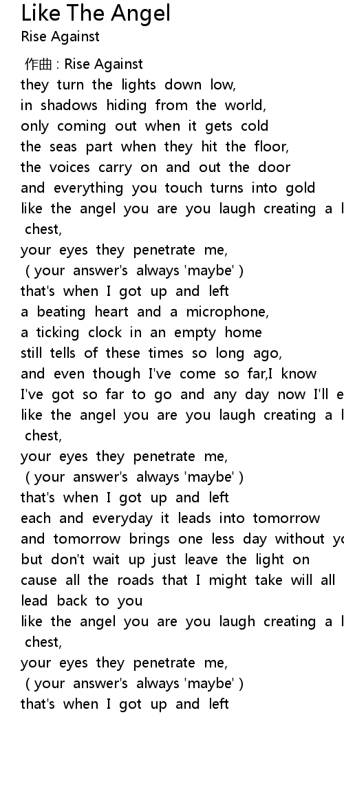 | [01:10.25] | like the angel you are you laugh creating a lightness in my chest, |