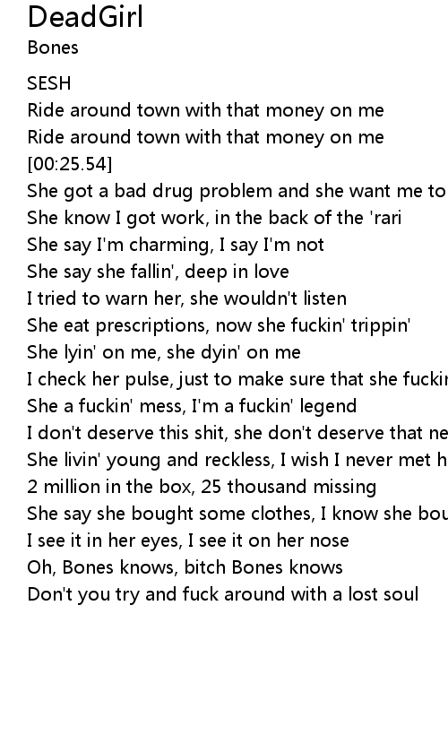 | [01:39.18] | Oh, Bones knows, bitch Bones knows |