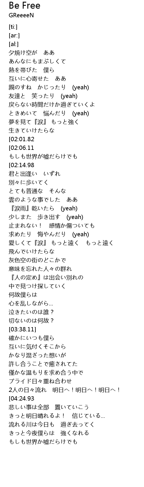 | [04:33.61][04:24.93][04:16.27][04:07.61] | BE FREE |