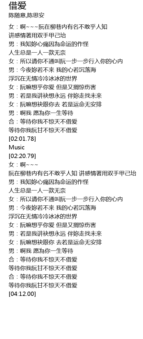 | [04:03.05] | 合:等待你我不惊天不借爱 等待你我阮甘不惊天不借爱 |