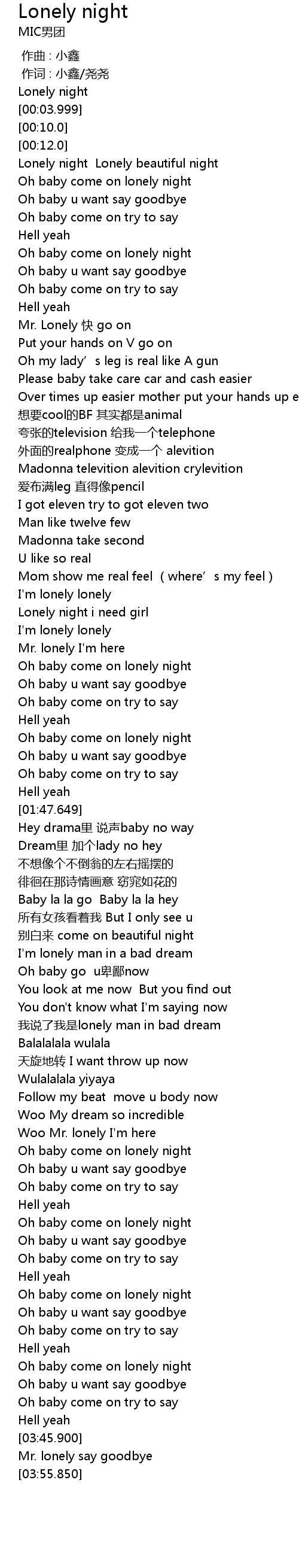 | [03:34.100] | Oh baby come on lonely night |