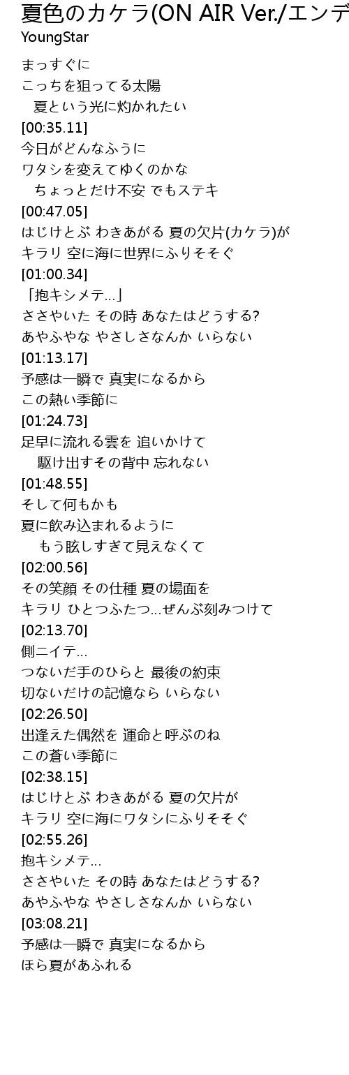 | [00:49.29] | はじけとぶ わきあがる 夏の欠片(カケラ)が |