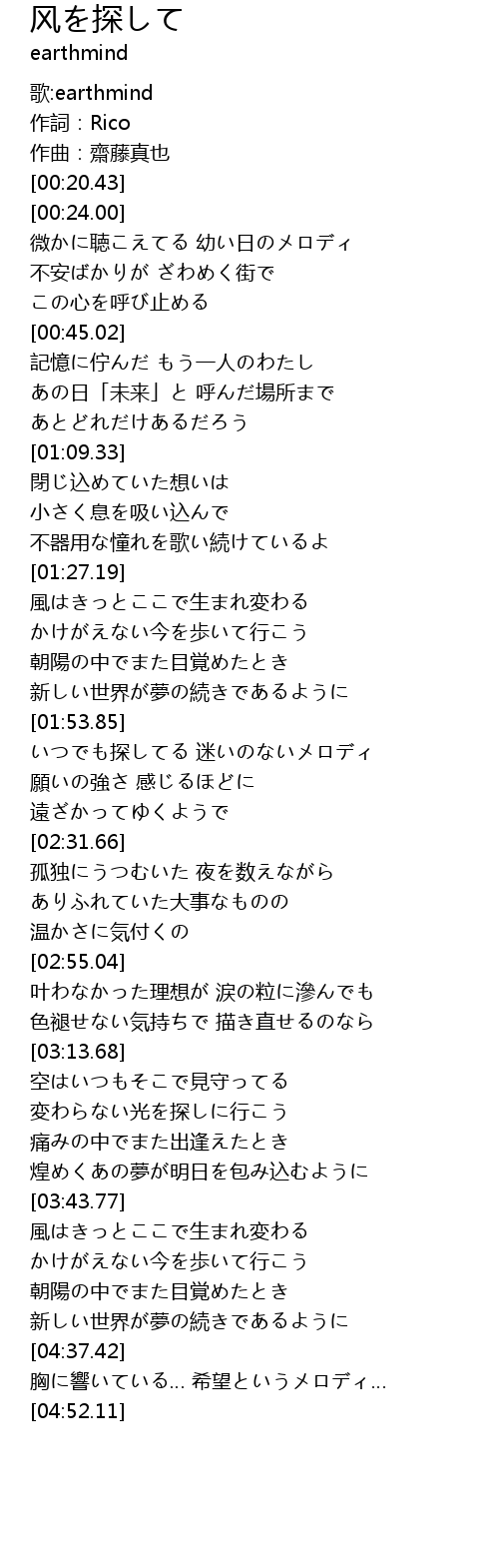 | [04:11.89] | 風はきっとここで生まれ変わる |