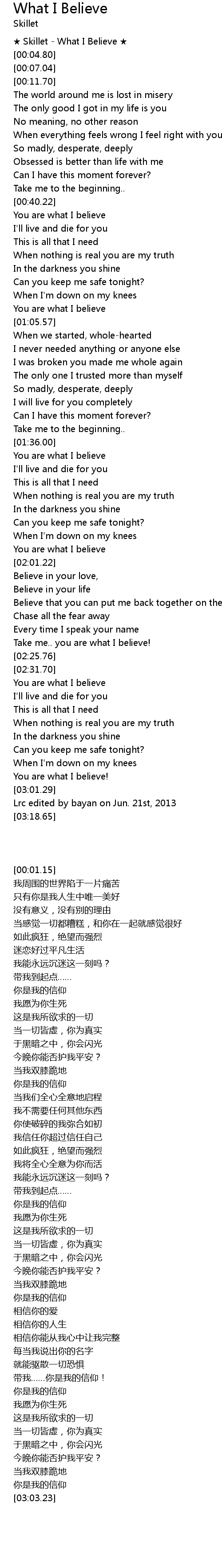 | [00:01.15] | ★ Skillet - What I Believe ★ |