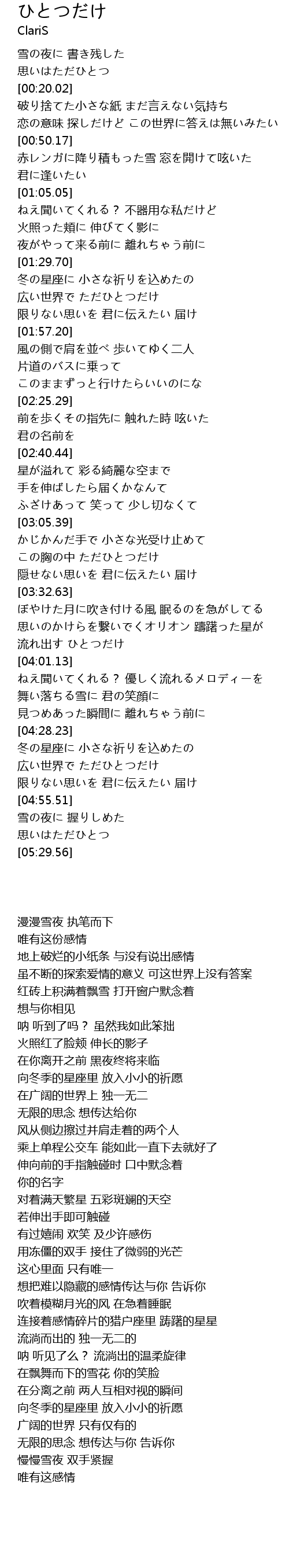 | [02:10.21] | 片道のバスに乗って このままずっと行けたらいいのにな |