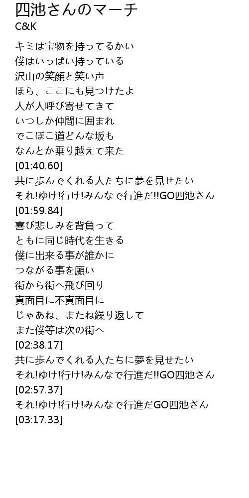 | [02:58.00] | それ!ゆけ!行け!みんなで行進だGO四池さん |