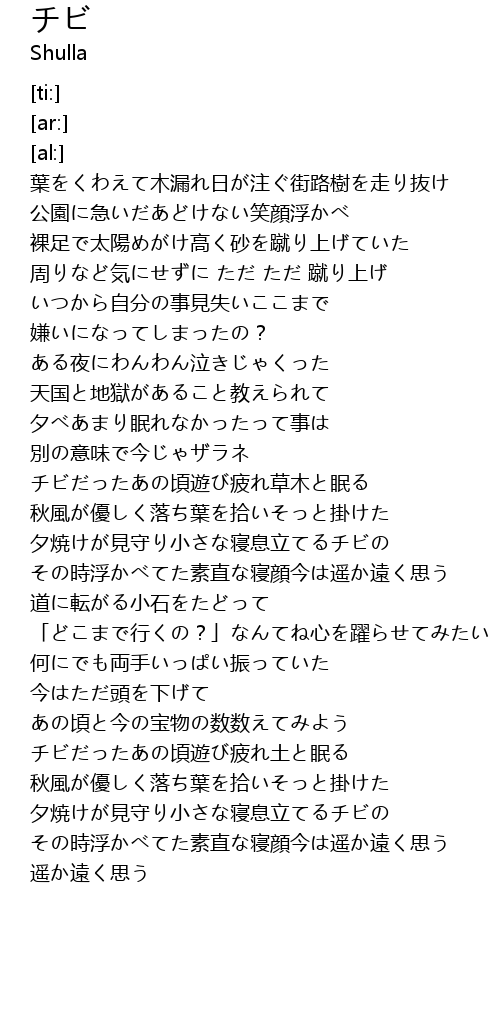 | [01:57.37] | 夕焼けが見守り小さな寝息立てるチビの |