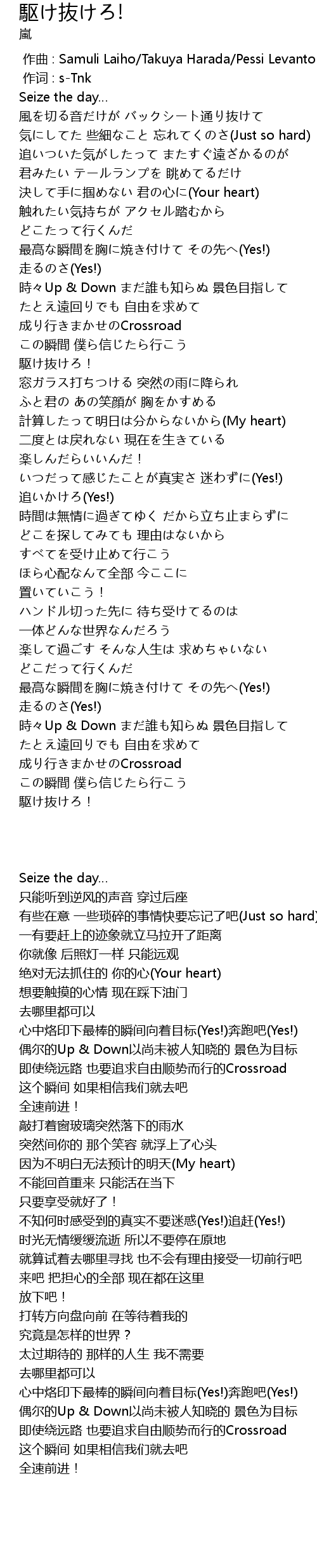 | [02:26.440] | いつだって感じたことが真実さ 迷わずに(Yes!) 追いかけろ(Yes!) |