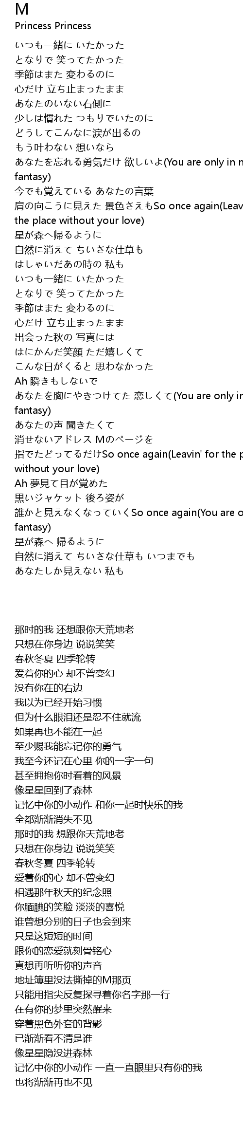 | [02:55.500] | あなたを胸にやきつけてた 恋しくて(You are only in my fantasy) |