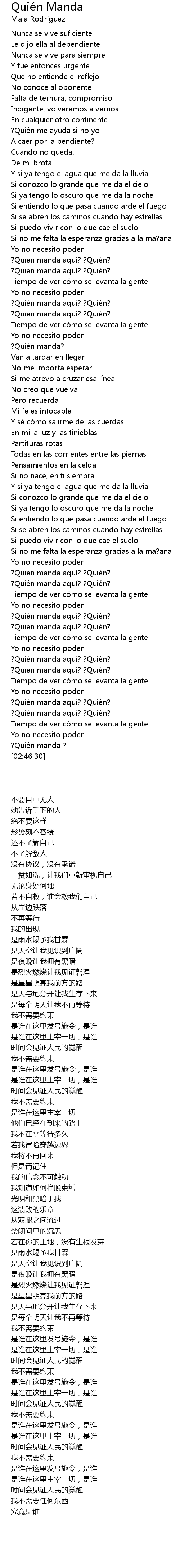 | [02:02.74] | ? Quie n manda aqui? ? Quie n? |