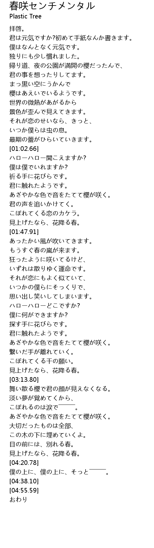 | [04:15.03] | 見上げたなら、花降る春。 |