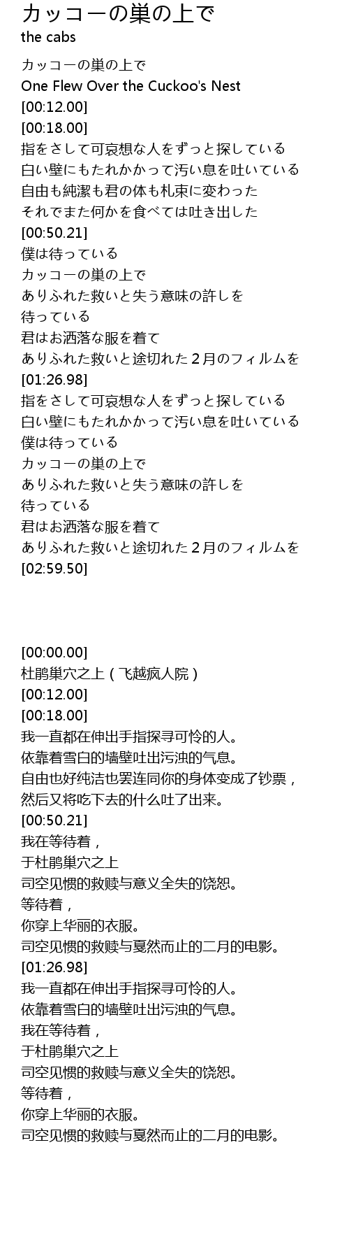 | [00:06.00] | One Flew Over the Cuckoo' s Nest |