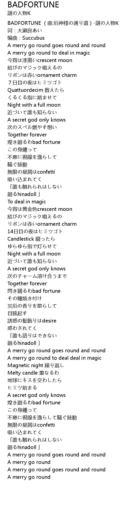 | [00:00.00] | BADFORTUNE (曲:厄神様の通り道)-謎の人物K |