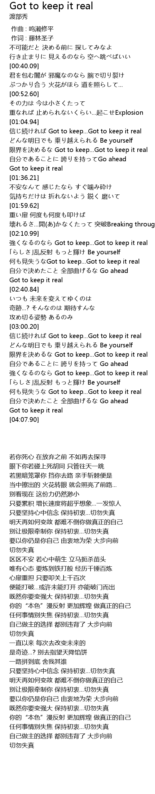 | [03:52.62] | 何も見失うな Got to keep...Got to keep it real |