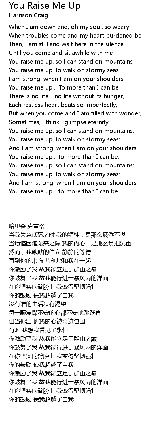 | [02:13.370] | You raise me up, so I can stand on mountains |
