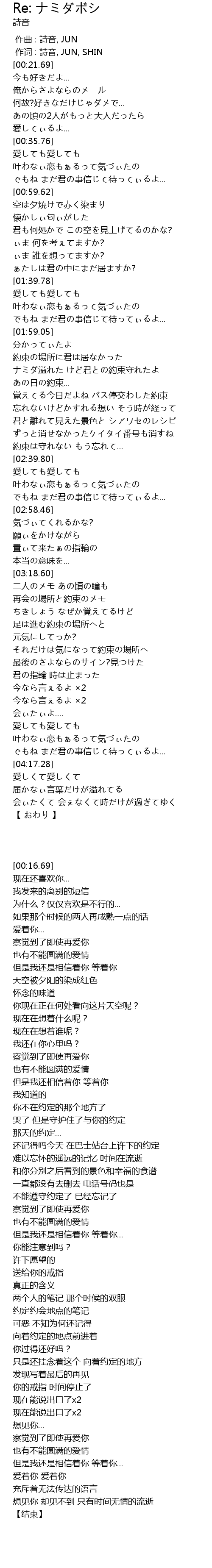 | [00:01.00] | 作词 : 詩音, JUN, SHIN |