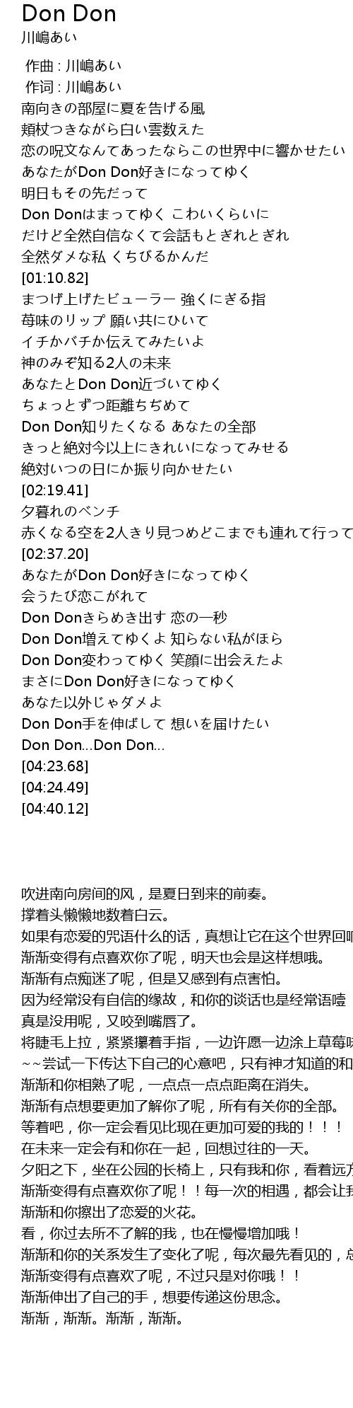 | [00:42.17] | あなたがDon Don好きになってゆく 明日もその先だって |