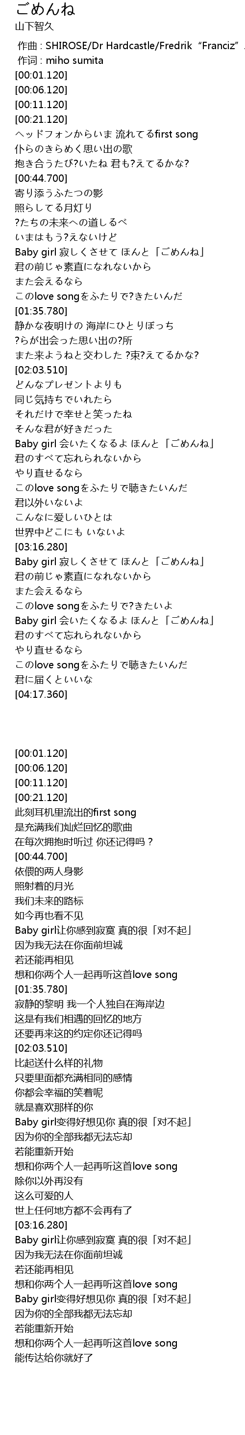 | [03:47.620] | Baby girl 会いたくなるよ ほんと「ごめんね」 |