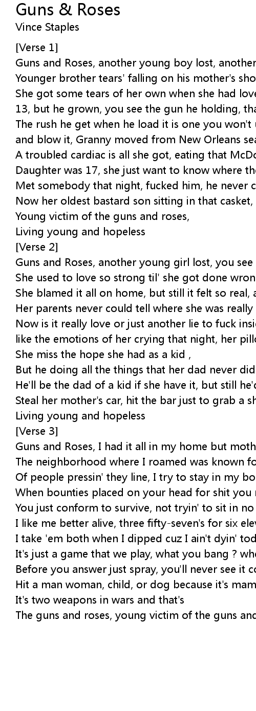 Guns and Roses, another young girl lost, you see her heart was broken, |
