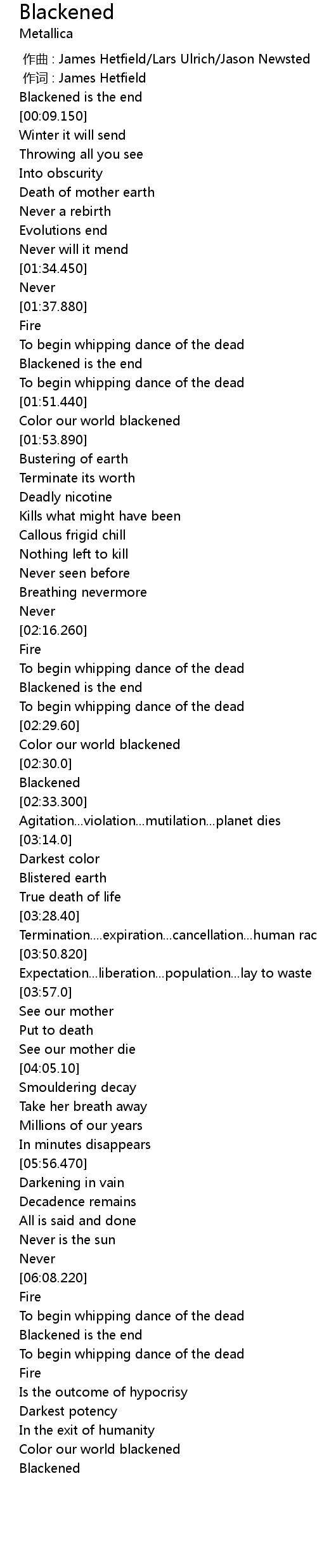 | [00:00.00] | 作曲 : James Hetfield/Lars Ulrich/Jason Newsted |