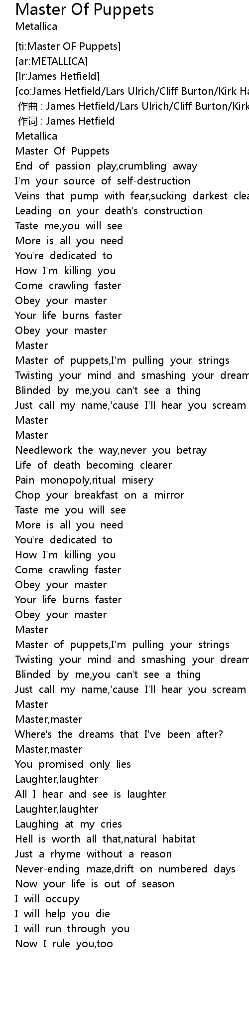 | [01:47.544] | Master of puppets, I' m pulling your strings |