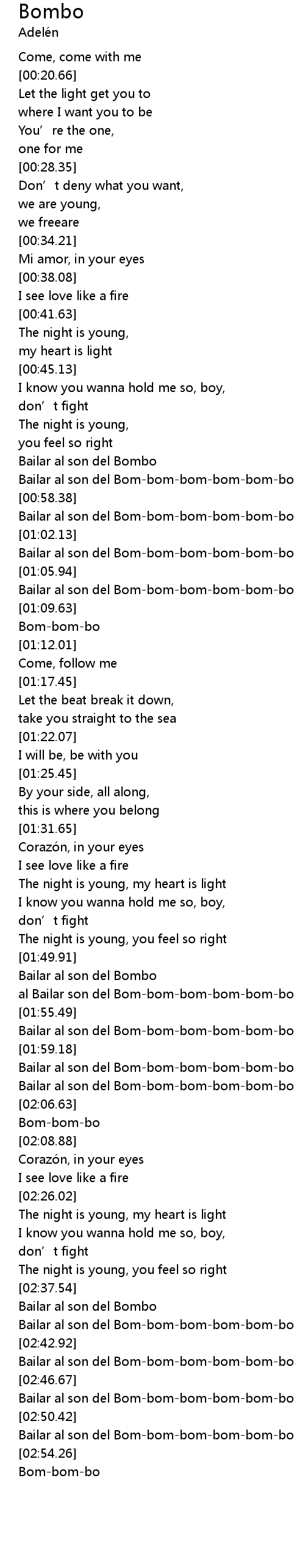 | [02:43.85] | Bailar al son del Bombombombombombo |