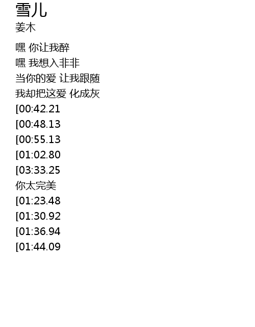 | [03:40.23][03:33.25][03:26.77][03:21.02][02:41.42][02:35.17][01:16.23][01:09.62] | 雪儿 你太完美 |