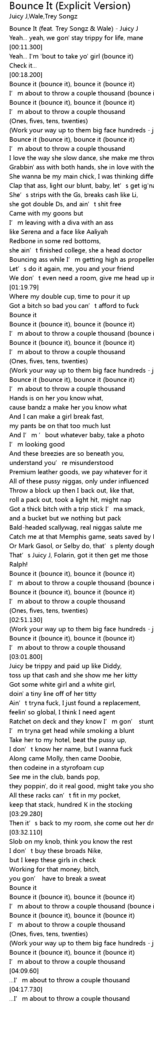 | [00:04.9] | Bounce It (feat. Trey Songz & Wale) - Juicy J |