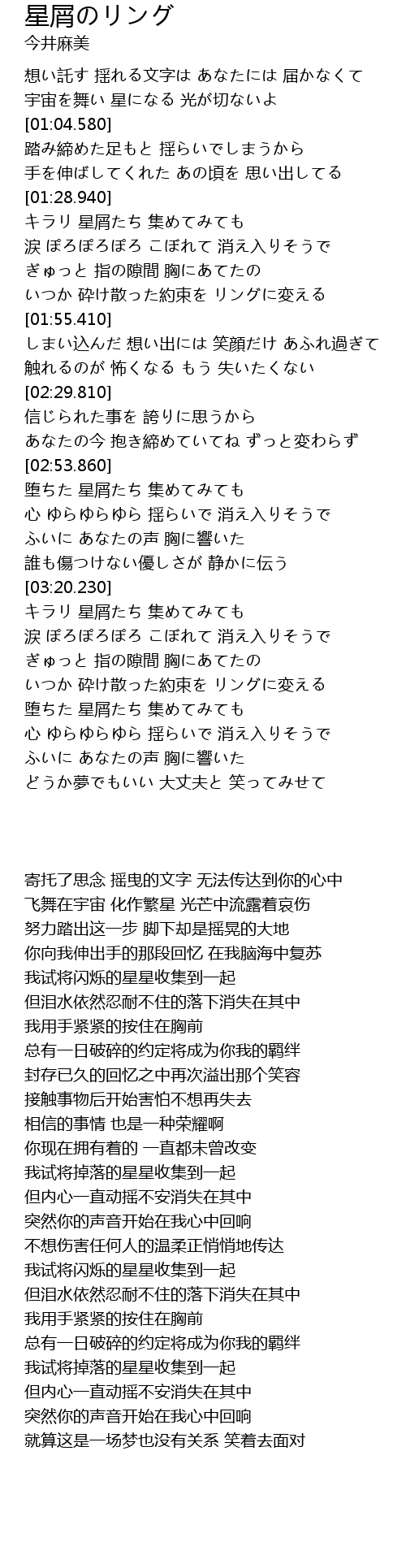 | [04:03.100] | いつか 砕け散った約束を リングに変える |