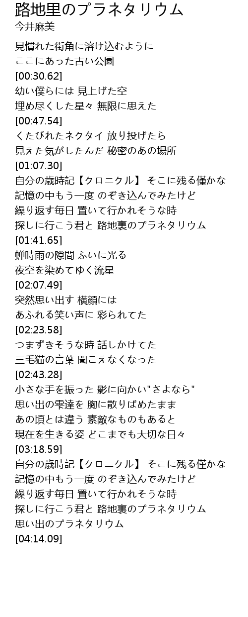 | [03:54.48] | 探しに行こう君と 路地裏のプラネタリウム |