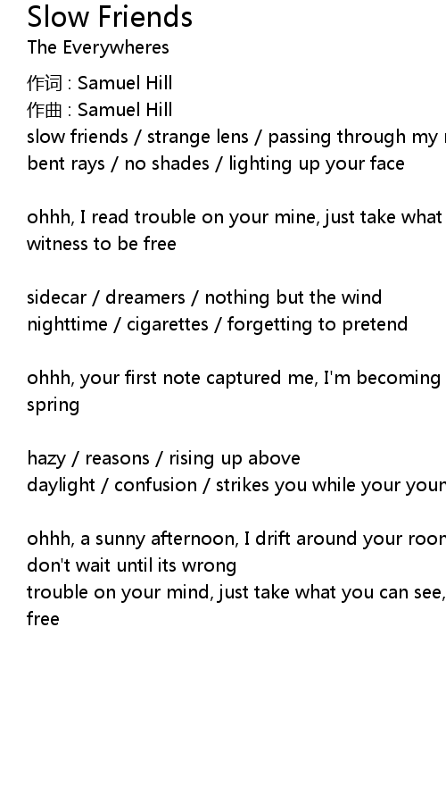 | ohhh, a sunny afternoon, I drift around your room, await your fate too long, don' t wait until its wrong | |