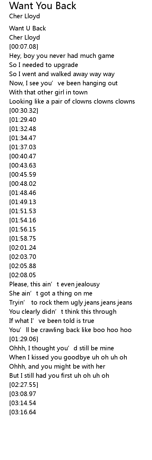 | [03:04.70][02:05.88][01:07.31] | Wawant you, want you back |