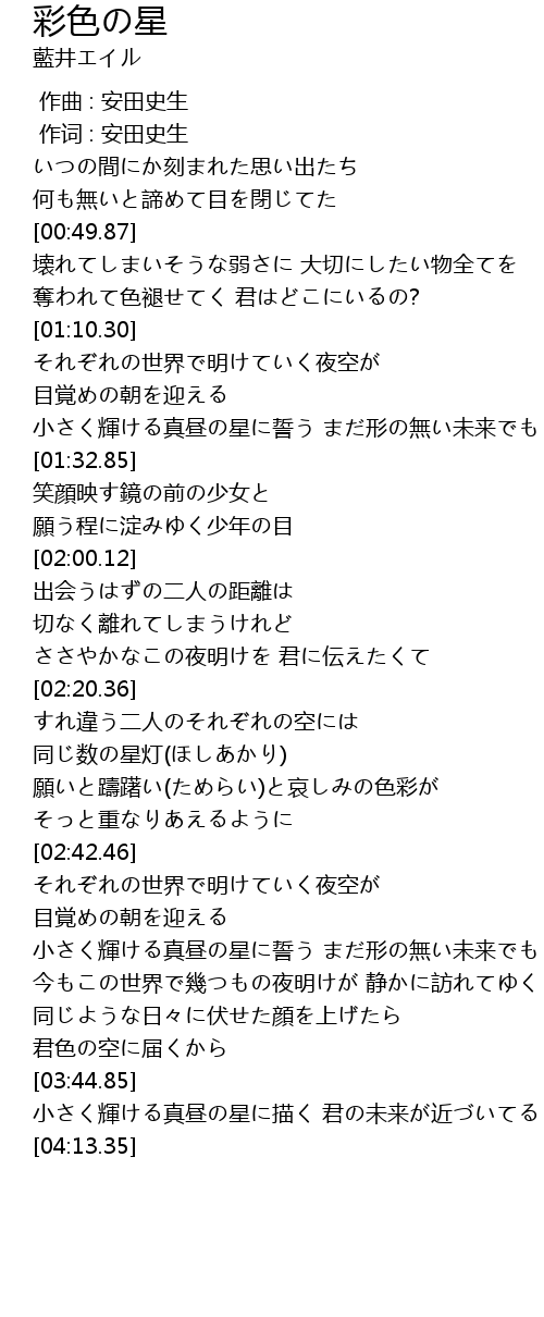| [03:13.04] | 小さく輝ける真昼の星に誓う まだ形の無い未来でも |