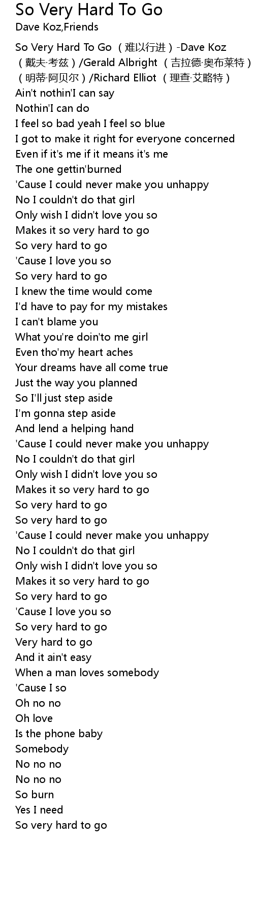 | [00:00.00] | So Very Hard To Go nan yi xing jin Dave Koz dai fu kao zi Gerald Albright ji la de ao bu lai te Mindi Abair ming di a bei er Richard Elliot li cha ai lue te |