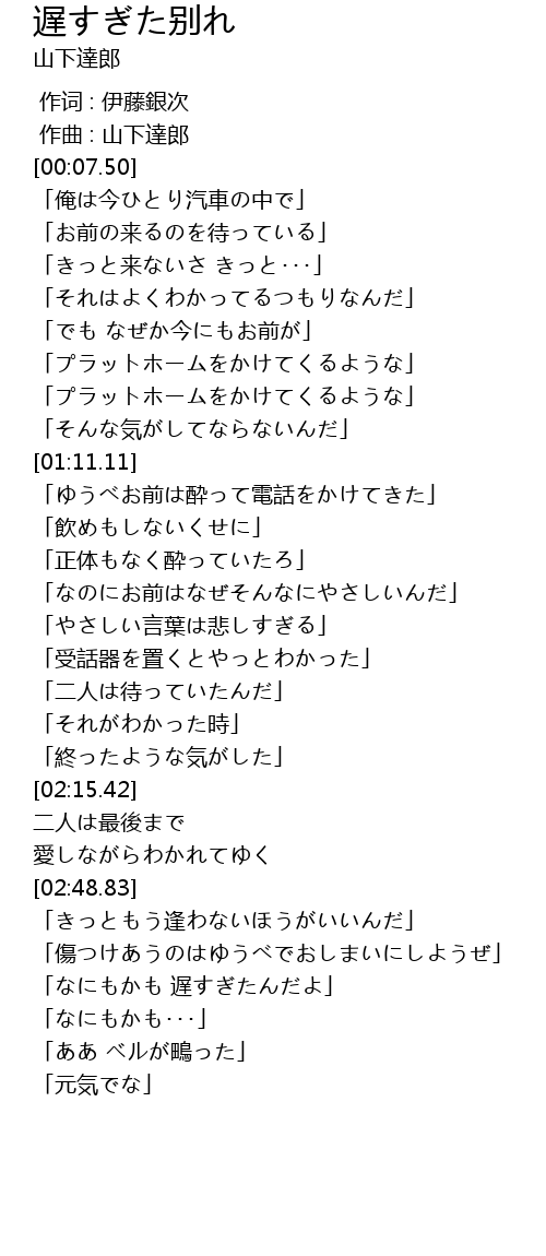 | [03:09.71] | 「なにもかも 遅すぎたんだよ」 |