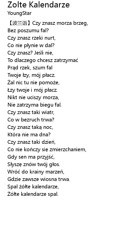 | [00:13.36] | 【波兰语】Czy znasz morza brzeg, |