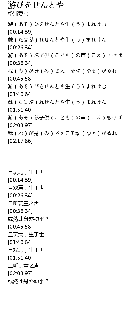 | [00:04.55] | 游(あそ)びをせんとや生(う)まれけむ |