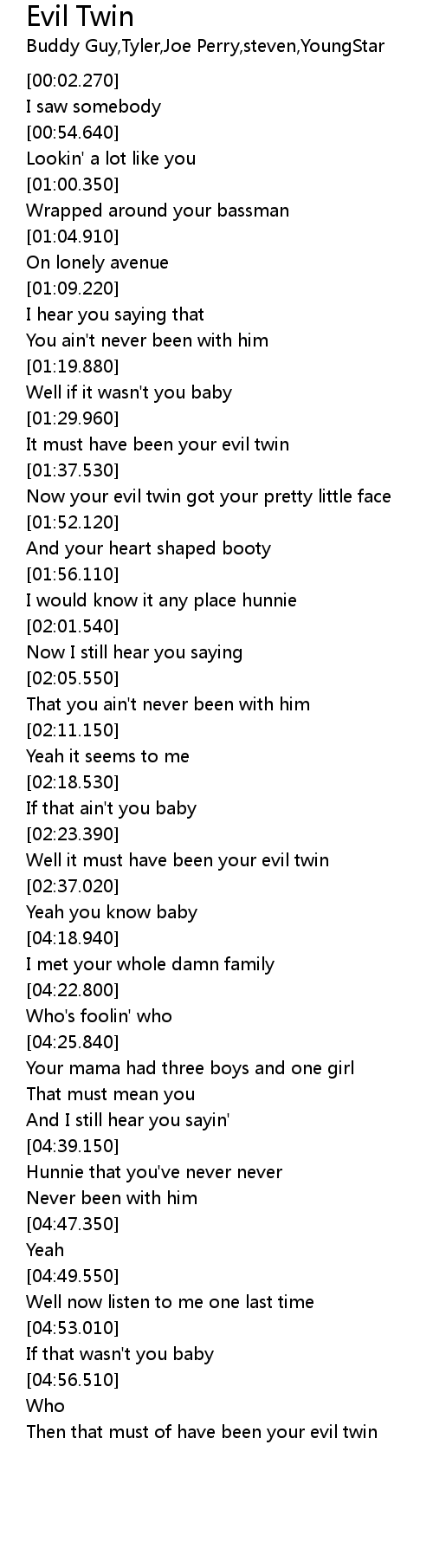 | [01:45.830] | Now your evil twin got your pretty little face |