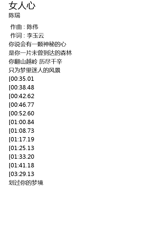 | [02:32.50][00:52.60] | 别说女人心是海底针 摸不着看不清 |