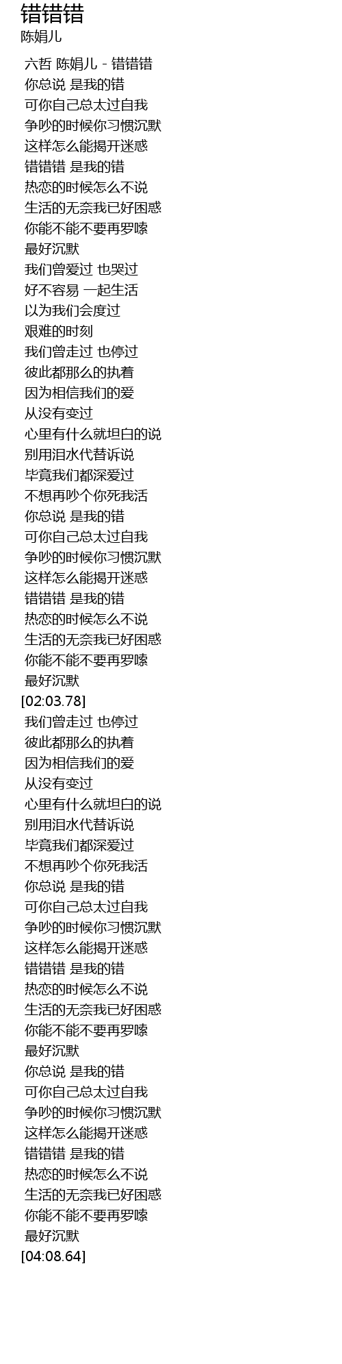 | [00:00.31] | 六哲 陈娟儿 - 错错错 |