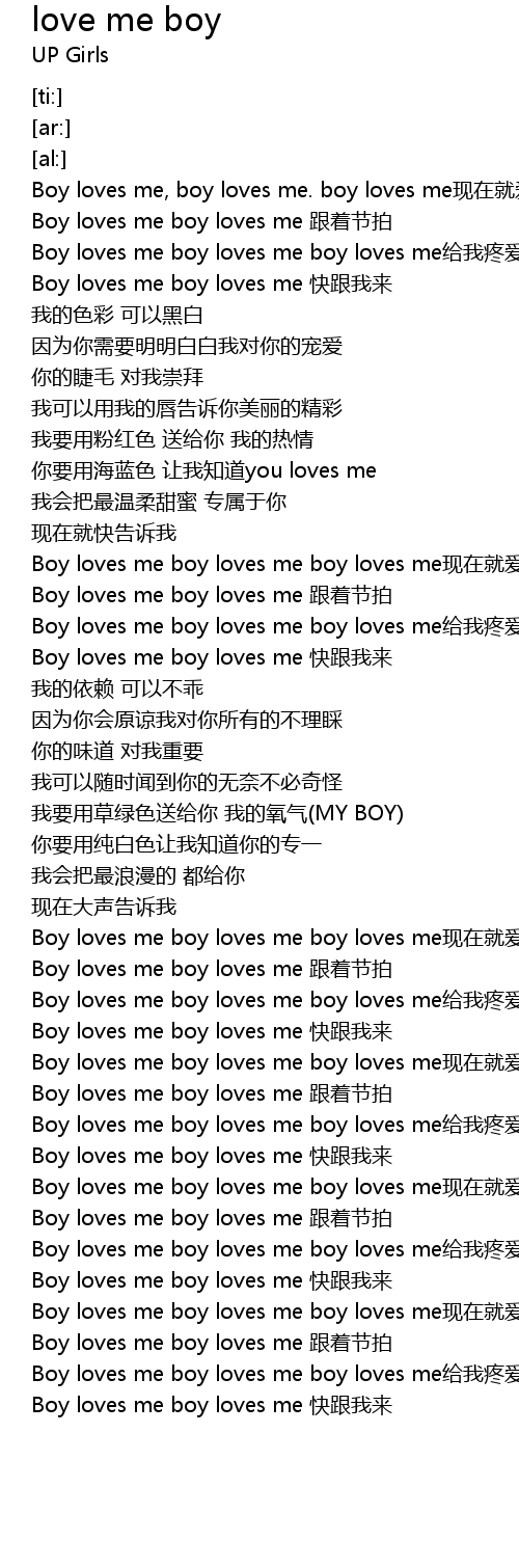 | [01:10.99] | Boy loves me boy loves me boy loves me gěi wǒ téng ài |