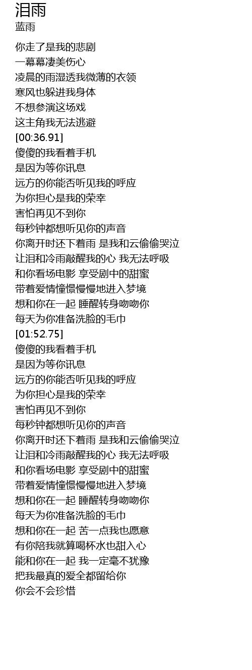 | [01:15.84] | 让泪和冷雨敲醒我的心 我无法呼吸 |